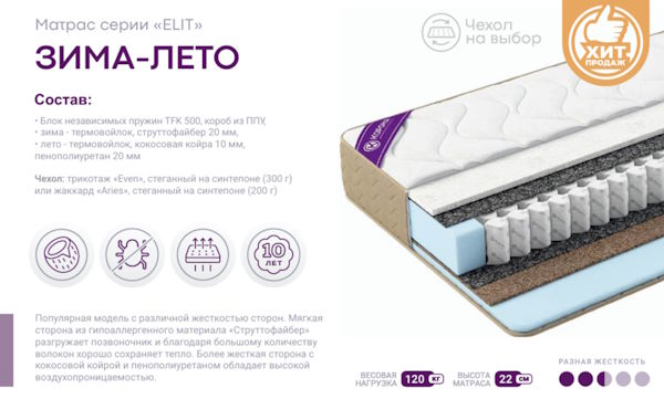 Популярная модель с различной жесткостью сторон. Мягкая сторона из гипоаллергенного материала «Струттофайбер» разгружает позвоночник и благодаря большому количеству волокон хорошо сохраняет тепло. Более жесткая сторона с кокосовой койрой и пенополиуретаном обладает высокой воздухопроницаемостью, что делает ее более прохладной.