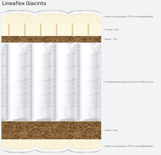 Матрас Giacinto – очень комфортная и большая модель от российского производителя «Линия Флекс». Рассчитан на семейную пару (максимальная нагрузка на одного человека 140 кг). Высота 21 см. Упругость относится к классу «комбинированная» – с одной стороны мягкий, с другой жесткий. Поэтому, если вам наскучил один вариант, можно перевернуть матрас и наслаждаться комфортом другого уровня.