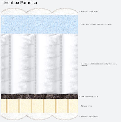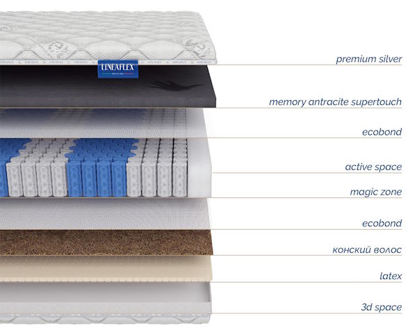 Основой является пятизональный независимый пружинный блок с разными натуральными наполнителями. Один из них – автомоделируемая орто-пена, способная добавить мягкой нежности в Ваш сон, а другой – латекс с конским волосом, гарантирующий полноценную жесткость Вашей кровати. Таким образом, Вы сами можете контролировать уровень комфорта, переворачивая матрас на ту или иную сторону.