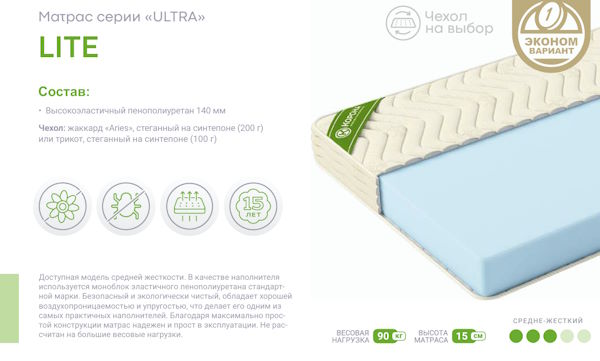 <comment>Искали легкий и удобный матрас для дачи, остановились на Ультра Лайт. Понравилось, что он с жаккардовым чехлом, который выглядит прочным и приятным на ощупь. Высота 16 см – оптимальна для комфортного сна, а жесткость средняя, что удобно для всей семьи. Наполнитель хорошо держит форму и не продавливается. Матрас рассчитан на нагрузку до 100 кг, и действительно выдерживает без прогибов. Единственный минус – упаковка могла бы быть плотнее. В целом довольны, сон стал заметно комфортнее! </comment>