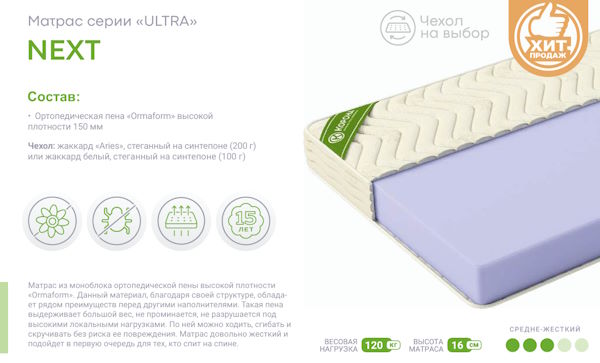 Матрас из моноблока ортопедической пены высокой плотности «Ormaform». Данный материал благодаря своей структуре обладает рядом преимуществ перед другими наполнителями. Такая пена выдерживает большой вес, не проминается, не разрушается под высокими локальными нагрузками - по ней можно ходить, сгибать и скручивать без риска ее повреждения. Матрас довольно жесткий и подойдет в первую очередь для тех, кто спит на спине.