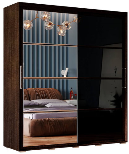 Модель изготовлена из ЛДСП, одна раздвижная створка выполнена из стекла, а вторая – зеркальная, такой прием облегчает конструкцию и позволяет расширить пространство, внутри модель состоит из многочисленных полок и ящиков для белья и одежды, а также отделения со штангой для плечиков.